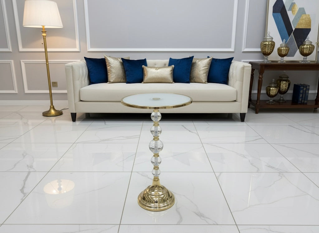 This exquisite accent side table is a stunning addition to any luxury living space, seamlessly blending classic opulence with modern design. It features a brilliant, highly polished gold base and top ring that beautifully frames a dramatic, towering column composed of stacked, multifaceted clear crystal spheres. The table top is finished with a smooth, clear glass surface that maintains the focus on the ornate column, and it includes a signature small, round golden circle positioned precisely in the center, adding a final touch of sophisticated detail. Its striking vertical presence makes it a perfect, glamorous companion next to a sofa or armchair, providing a functional yet undeniably artistic focal point.