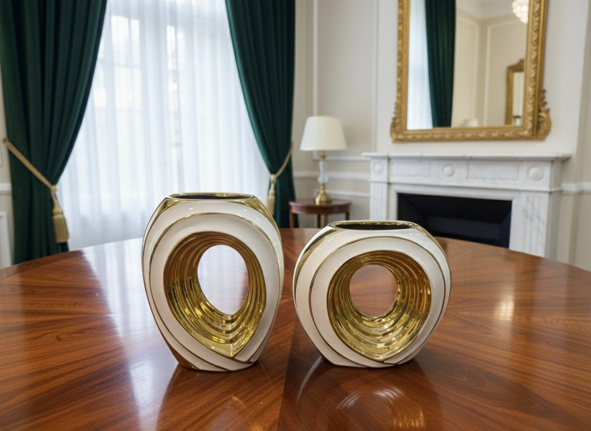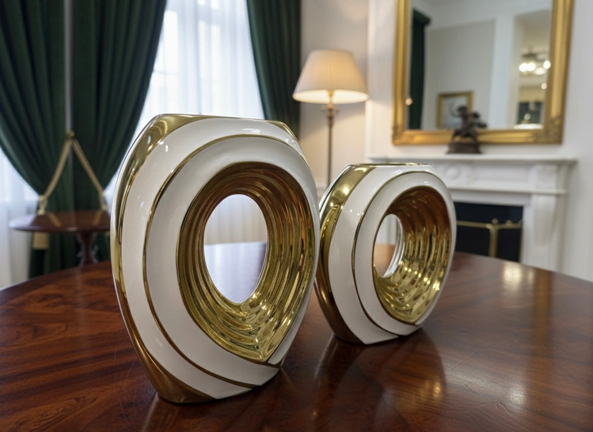 This exquisite set of two ceramic vases features a striking abstract, elongated loop design, beautifully rendered in a sophisticated white glaze with opulent gold detailing tracing the contours of the swirling, open center. Resting on a luxurious, dark marble surface that highlights their crisp, reflective finish, these statement pieces merge modern sculptural art with classic elegance. They are perfectly sized and styled to serve as a captivating focal point on a coffee table, console, or shelf in a contemporary or transitional living space, offering an immediate touch of high-end, artistic flair without the need for flowers.