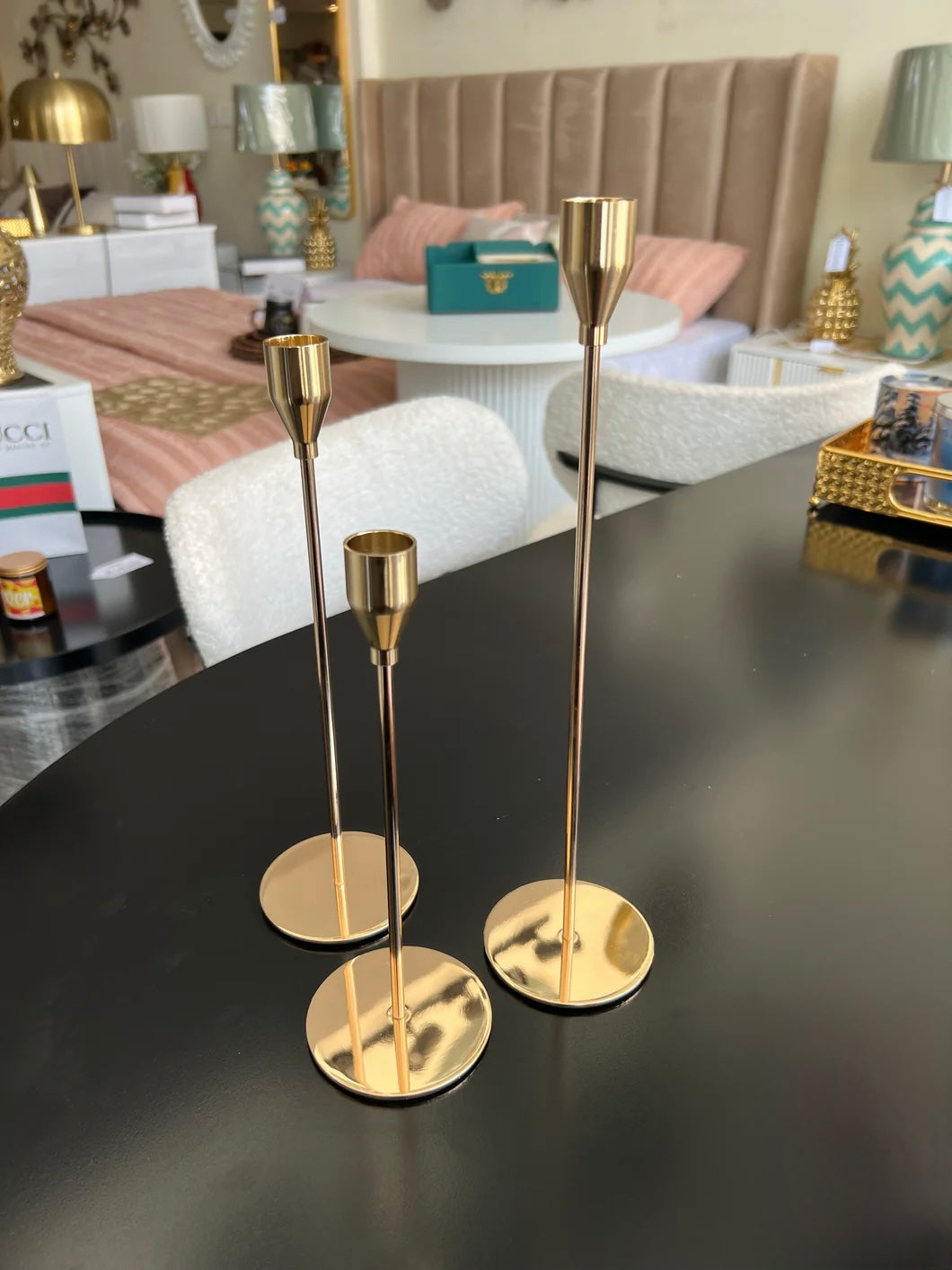 The set includes three candlesticks of varying heights, each featuring a tall, slender stem and a sturdy, round base. The design is minimalist and modern, intended to hold taper candles.They are suitable for home decoration and can be used as a centerpiece for various occasions such as weddings, parties, or candlelight dinners.