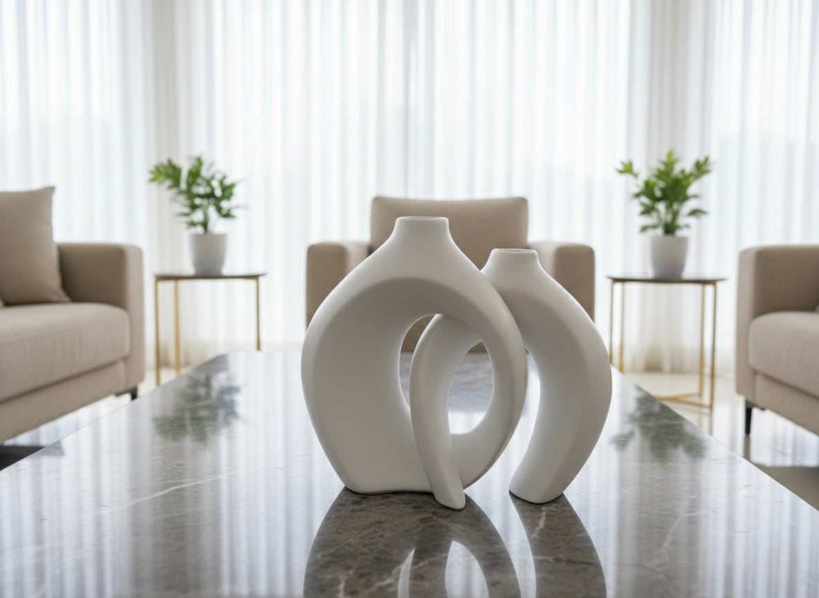 Elevate your home decor with this striking set of two modern abstract vases, designed to create a sense of fluid, interlocking unity. Crafted in pristine white, the smooth, matte finish highlights the sculptural, continuous loop design, making it a sophisticated focal point for any shelf, table, or mantelpiece. The taller vase is elegantly filled with natural, golden dried grass accents, providing a complementary texture and a warm, organic contrast to the cool, contemporary lines of the art. This piece is perfect for adding an artistic, minimalist touch to your living room, office, or bedroom and pairs beautifully with contemporary or transitional interior styles.
