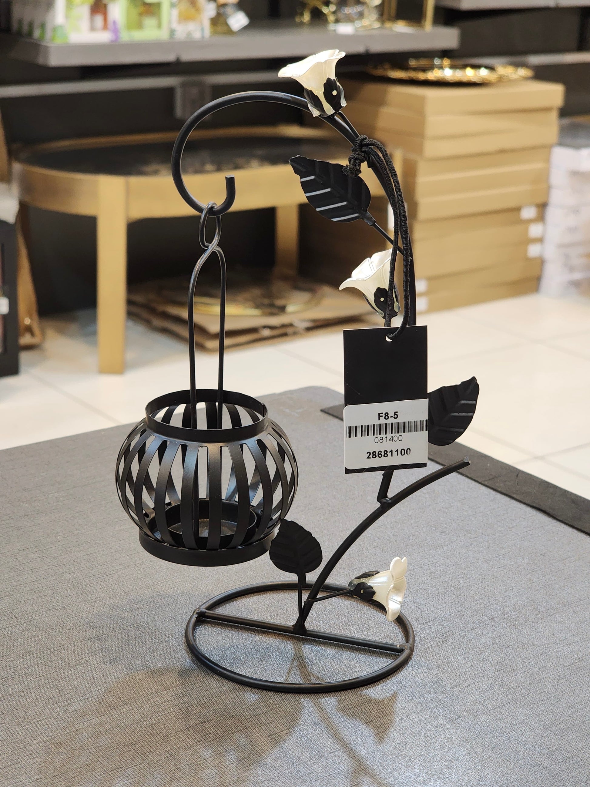 This exquisite decorative piece combines the industrial charm of wrought iron with the delicate grace of nature-inspired aesthetics. Featuring a curved, vine-like silhouette adorned with cream-colored floral accents and stylized black leaves, the stand cradles a suspended, spherical cage-style lantern—perfect for housing tea lights or small votives. Its matte black finish and sturdy circular base offer a sophisticated, modern-gothic appeal that serves as a striking centerpiece for dining tables, mantels, or cozy garden-themed interior displays.