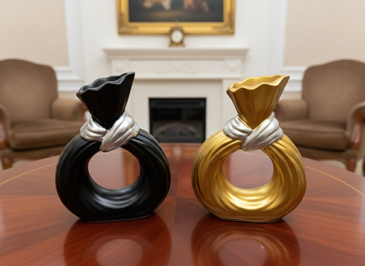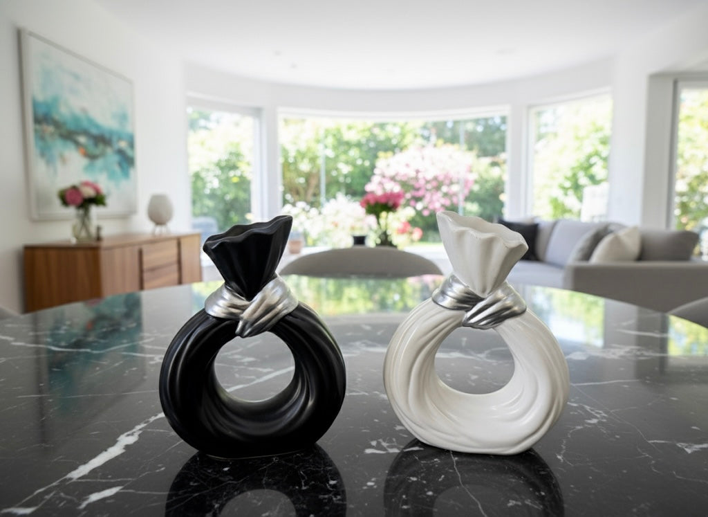 That is a Modern Sculptural Vases, one in black and one in white, each featuring a polished silver-tone hand design cinching the neck, presented on a sleek, high-gloss surface against a bright, contemporary interior with a large window view of lush greenery, making them an ideal, eye-catching decorative statement piece for sophisticated living spaces.