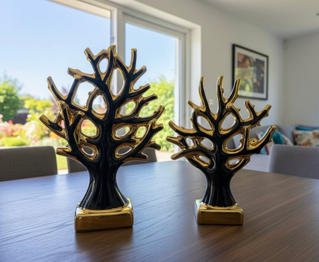 Add a touch of modern elegance to your home with this stunning set of two abstract tree sculptures. Each piece is crafted from high-gloss ceramic, available in classic white or striking black, and finished with luxurious gold-plated accents and a matching base. Perfect for styling a mantel, coffee table, or bookshelf.
